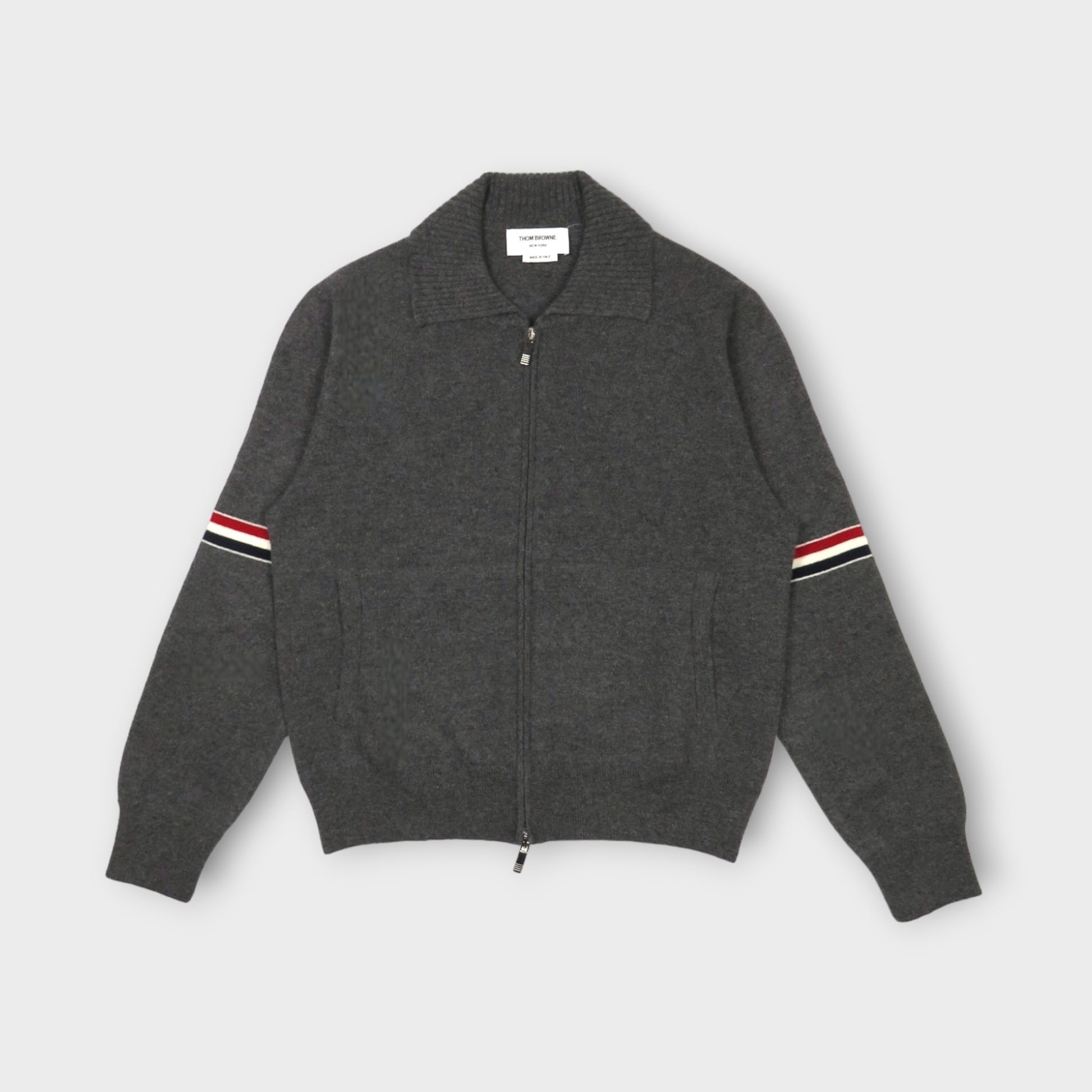 THOM BROWNE JERSEY FLOAT JACQUARD STITCH POLO COLLAR FULL ZIP IN CASHMERE W/ RWB ARMBAND